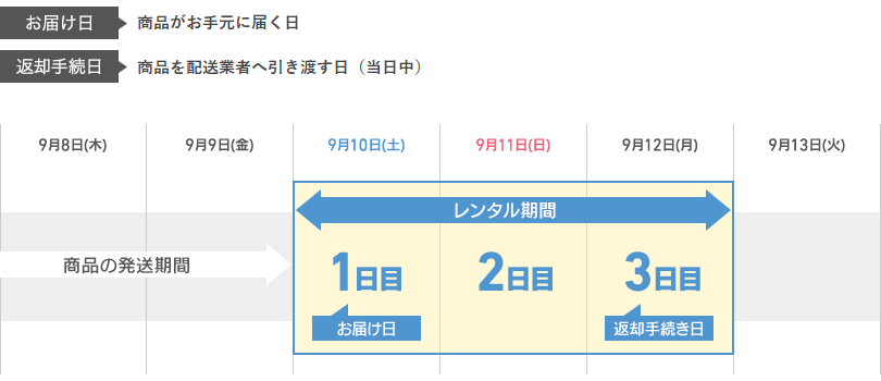 レンタル期間とは「商品のお届け日」から「返却手続日」までを言います。発送期間、返却期間はレンタル期間には含みません。